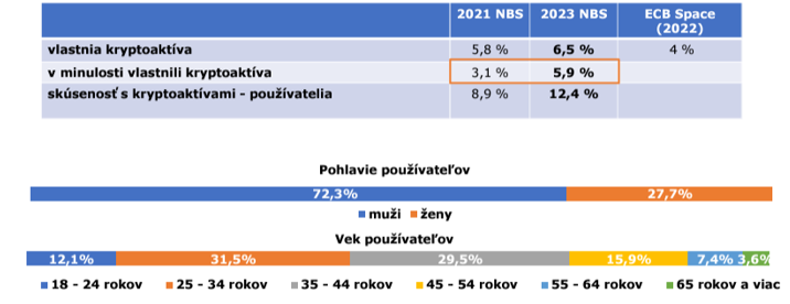 Zaujímavé je aj porovnanie prieskumu v roku 2021 a 2023, kde jasne vidieť, že kryptomeny dnes vlastní čoraz viac Slovákov. Až 12,4 % respondentov malo skúsenosť s kryptomenami ako používatelia. Zrejme nie je prekvapivé, že väčšinu používateľov tvoria práve muži (72,3 %) – ženy predstavujú menšinu (27,7 %). Najväčší záujem o kryptomeny prejavujú Slováci vo vekovej kategórii 25 – 34 rokov (31,5 %) a 35 – 44 rokov (29,5 %).