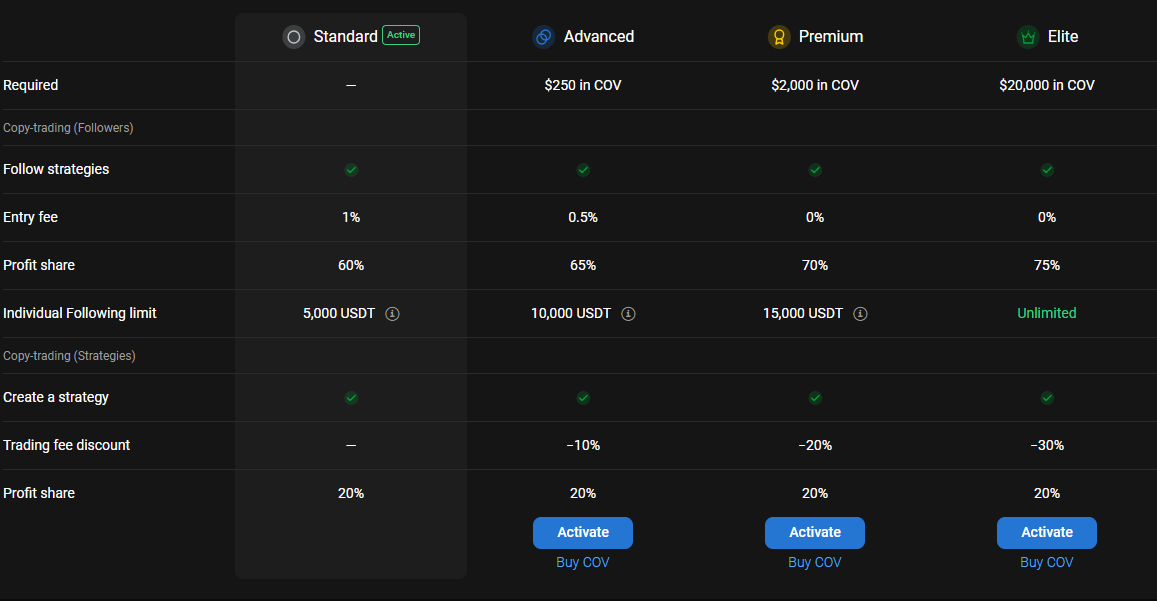 Ostáva sekcia Wall of Fame a My COV. Sekcia Wall of Fame predstavuje zoznam tých najlepších stratégii v histórii na PrimeXBT. Poslednou je možnosť My COV. COV je pomocný token určený na poskytovanie odmien, zliav a iných výhod v rámci produktov, ako je napríklad aj copytrading. Vaša úroveň členstva COV Standard, Advanced, Premium alebo Elite je založená na množstve COV, ktoré ste uzamkli v stakingu. Tieto členstvá a ich výhody sú zobrazené na obrázku nižšie.