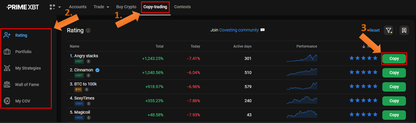 Teraz, keď už viete, čo je copytrading, je načase ukázať si, ako táto funkcionalita funguje na obchodnej platforme PrimeXBT. Do tejto sekcie sa dostanete cez hlavné menu. V tejto kapitole si ukážeme, aké všetky výhody môžete využívať pri copytradingu na PrimeXBT.