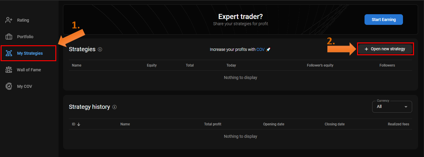 Svoje copytrading portfólio viete následne sledovať v sekcii Portfolio. Avšak PrimeXBT vám umožňuje vytvoriť si aj svoje vlastné portfólio, a to v sekcii My Strategies (podľa postupu, ktorý vidíte na obrázku dole).