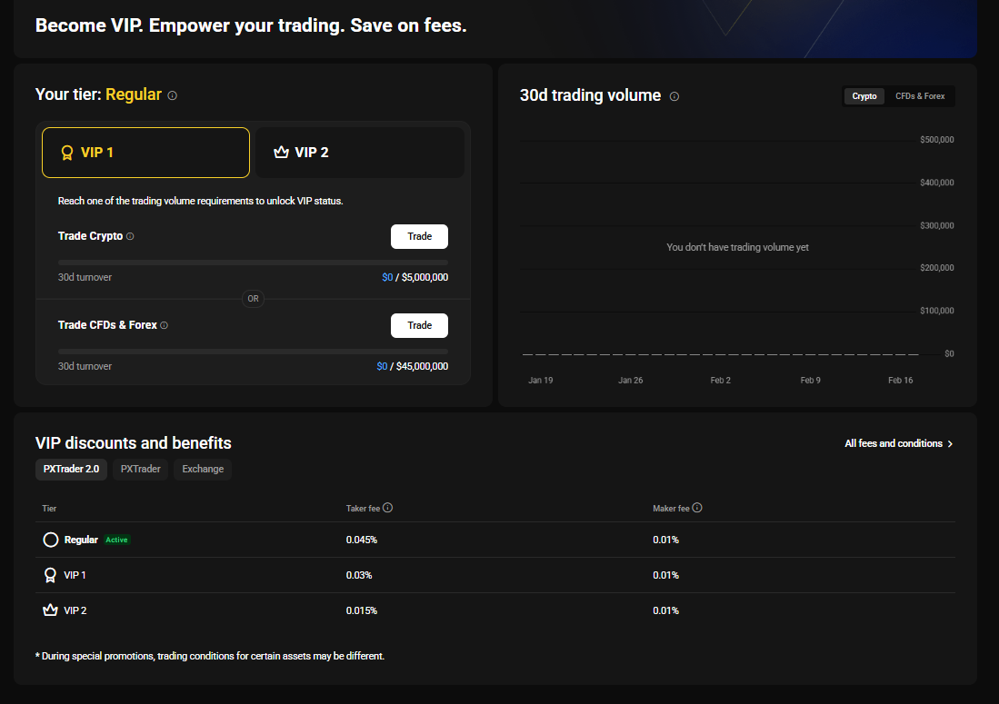 VIP úrovne na PrimeXBT umožňujú obchodníkom ušetriť na poplatkoch v závislosti od ich obchodného objemu za posledných 30 dní. Existujú tri úrovne: Regular, VIP 1 a VIP 2.