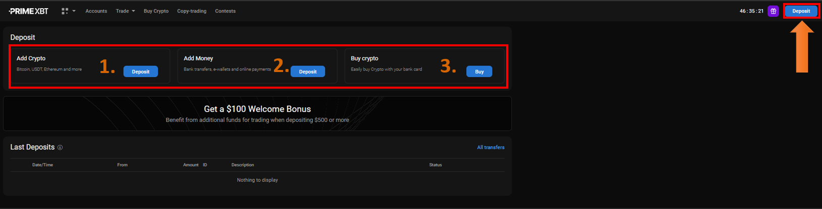 V tomto momente máte všetky potrebné informácie na to, aby ste mohli uskutočniť vklad na burzu PrimeXBT. Stačí na domovskej stránke kliknúť na Deposit a zobrazia sa vám možnosti vkladu, ktoré vidíte na obrázku nižšie.