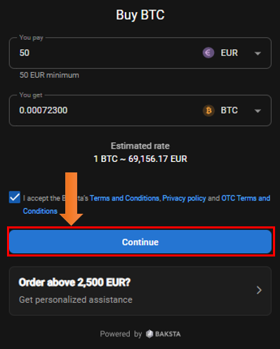 - Buy Crypto – urýchlené nakupovanie vami zvolenej kryptomeny cez platobný príkaz. Stačí zvoliť kryptomenu a sumu, za ktorú ju chcete nakúpiť. Všimnite si, že napríklad na kúpu Bitcoinu je potrebné investovať minimálne 50 eur. Kliknete na Continue a následne vyplníte dodatočné informácie o vašom bydlisku.