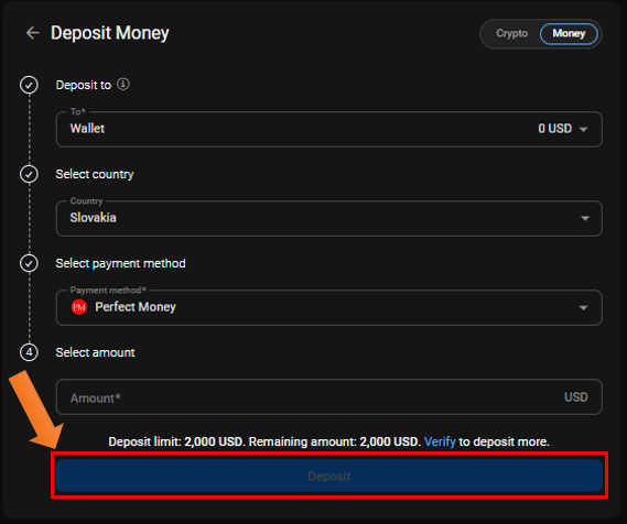 - Add Money – v tejto možnosti viete priamo vkladať peniaze z bankového účtu na burzu. Stačí zvoliť krajinu, peňaženku a platobnú metódu so sumou.