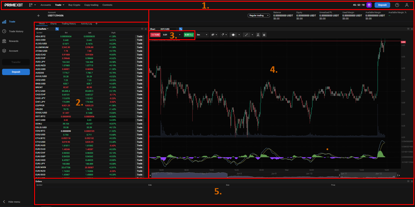 Následne budete presmerovaný na obchodnú platformu. Táto platforma slúži na zadávanie obchodných príkazov pre kryptomeny, komodity, indexy a forex. Obchodnú platformu sme rozdelili na týchto 5 základných sekcií: