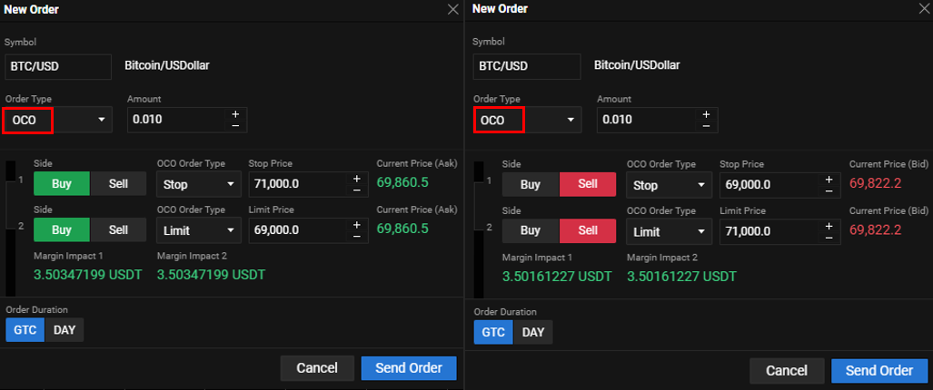 Predaj: Pri predaji, keď Bitcoin dosiahne 71 000 USD, limitný príkaz bude splnený. Naopak, keď Bitcoin dosiahne 69 000 USD, spustí sa príkaz stop na predaj. V oboch prípadoch obchodujeme množstvo 0,01 BTC.