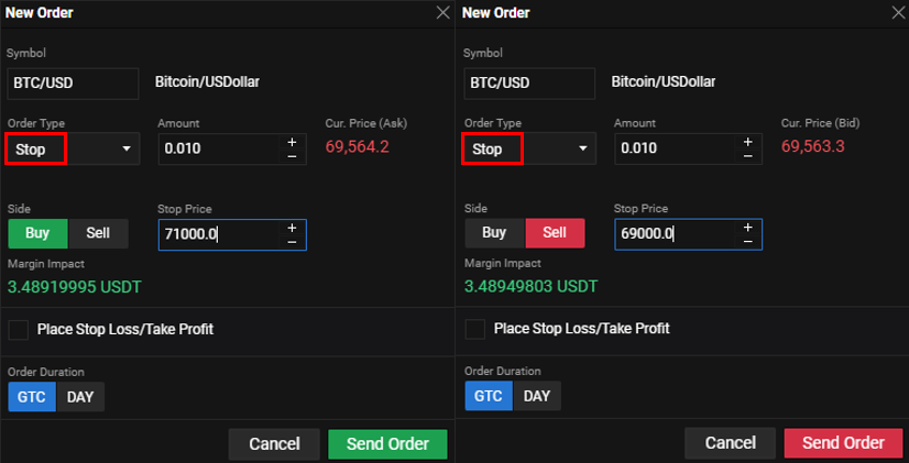 V našom príklade sa Bitcoin obchoduje za 69 500 USD. Ak cena stúpne na 71 000 USD, zrealizuje sa trhový nákupný príkaz. Naopak, ak cena klesne na 69 000 USD, zrealizuje sa predajný trhový príkaz. V prípade nákupu veríme, že cena prekonala dôležitú rezistenciu a bude pokračovať v raste. V prípade predaja veríme, že cena neudržala silný support a bude naďalej klesať.