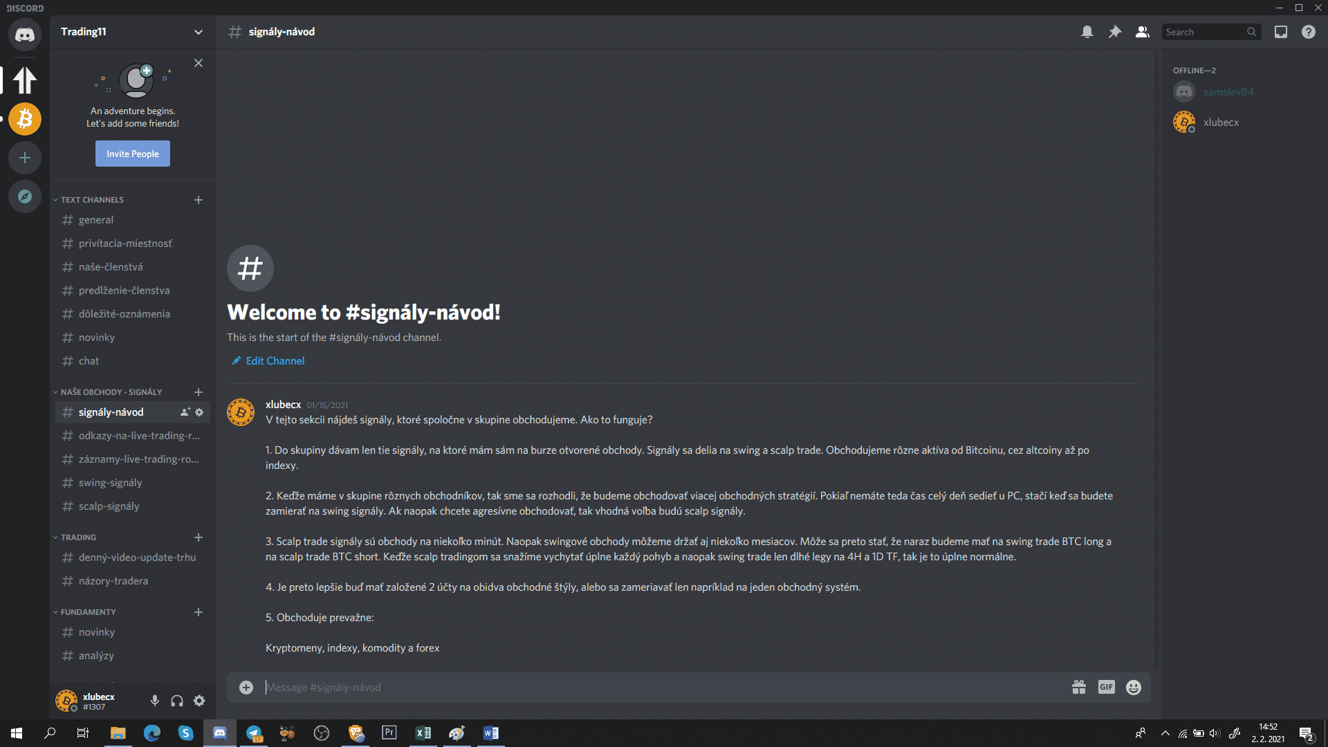 Discord funguje na princípe jedného veľkého servera, kde po vstupe nájdete rôzne miestnosti. Oproti Telegramu je to oveľa prehľadnejšie, keďže napríklad signály majú svoju miestnosť, analýzy tiež a aj vzdelávanie. Celkovo v rámci našich VIP členstiev je všetko rozdelené na viac ako 30 miestností. Takže o prehľadnosť sa nemusíte obávať.