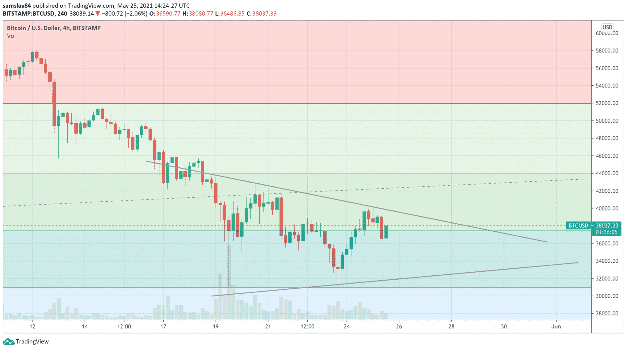 Bitcoin je momentálne v rovnoramennom trojuholníku a pokiaľ sa po internete nerozšíri ďalší FUD, pravdepodobne ho podrží spodná trendová línia, ktorú tvoria minimá z minulej stredy a nedele. Takže buďme pripravení na možný pád na cenu cca 32 000 dolárov. Dúfajme, že trh nedosiahne nižšie lokálne minimum. Tým by sa rovnoramenný trojuholník zmenil na klesajúci kanál.
