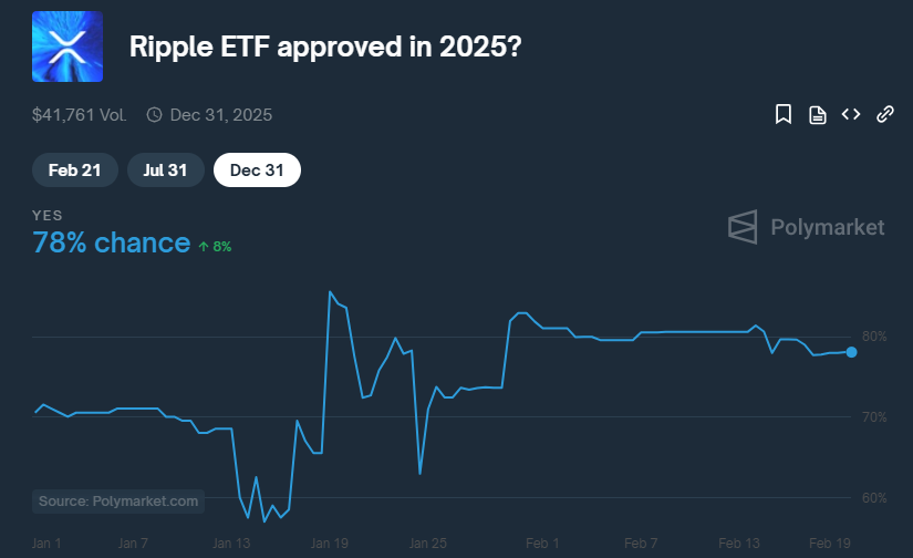 Podľa údajov z predikčného trhu Polymarket je 78 % pravdepodobnosť, že SEC schváli ETF pre XRP v roku 2025, uvádza správa News Bitcoin. Tento odhad prevyšuje 65 % pravdepodobnosť, ktorú uvádzajú analytici z Bloombergu, Eric Balchunas a James Seyffart. Viaceré spoločnosti ako 21Shares, Grayscale, Bitwise, Canary Capital a WisdomTree už podali žiadosti na uvedenie XRP ETF na trh.