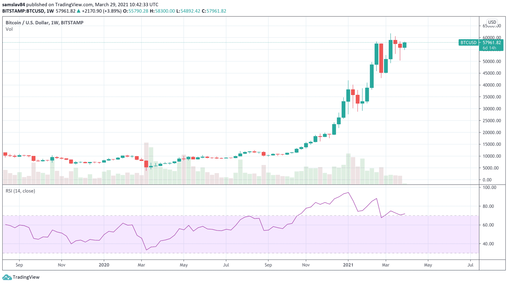 Aktuálne sa už opäť špekuluje, či prekonáme aj 60 000 dolárov, resp. či v apríli okamžite vystrelíme na nové historické maximum. Vyzerá to tak, i keď istotu samozrejme nemáme. Tú v kryptomenách nehľadajte.