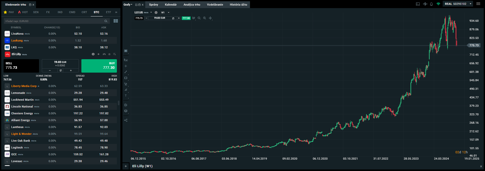 Akcie spoločnosti Eli Lilly (LLY) môžete nakúpiť na platforme XTB už dnes, a to od malej mesačnej sumy, ako môžete vidieť na obrázku nižšie.