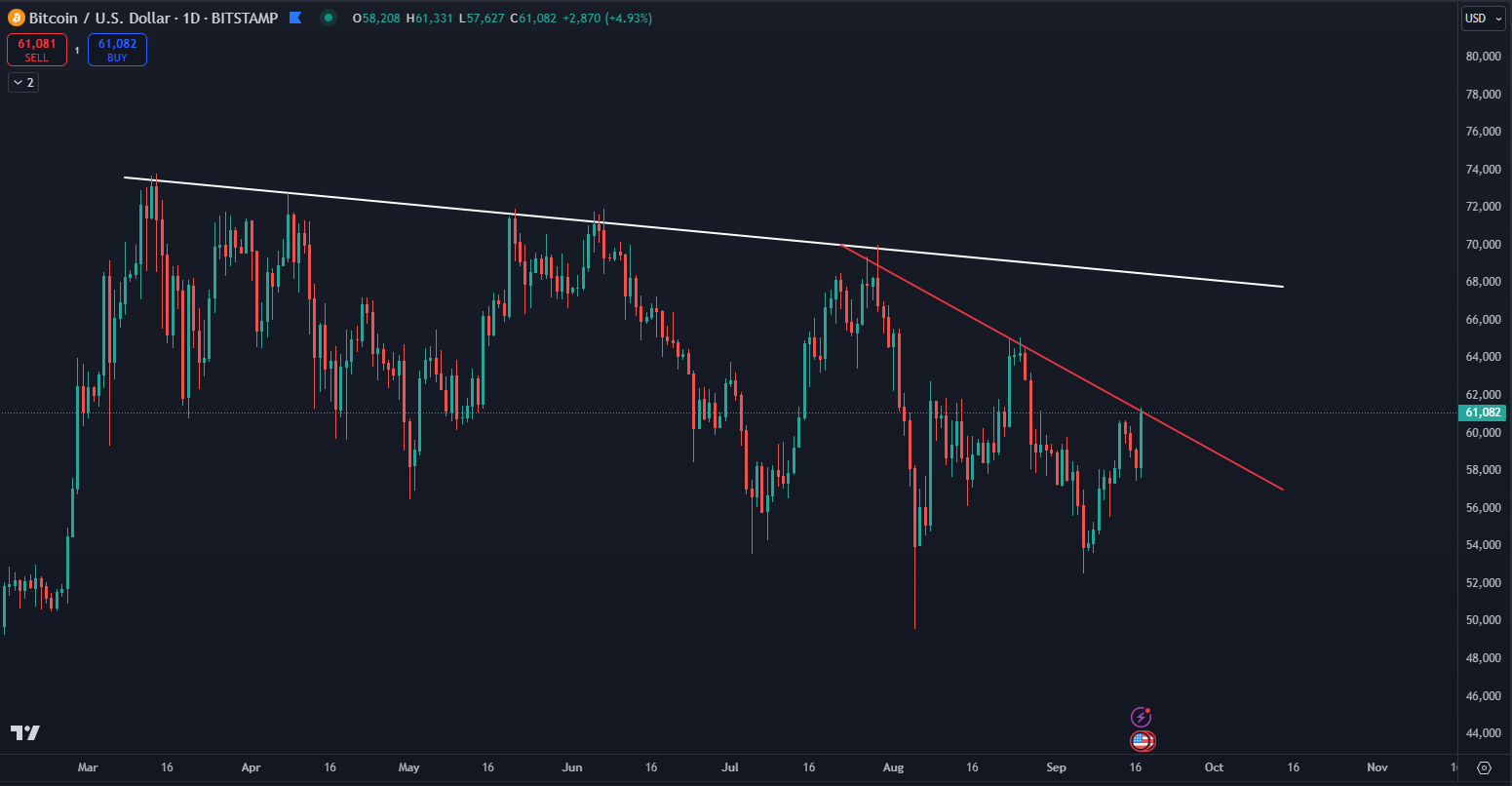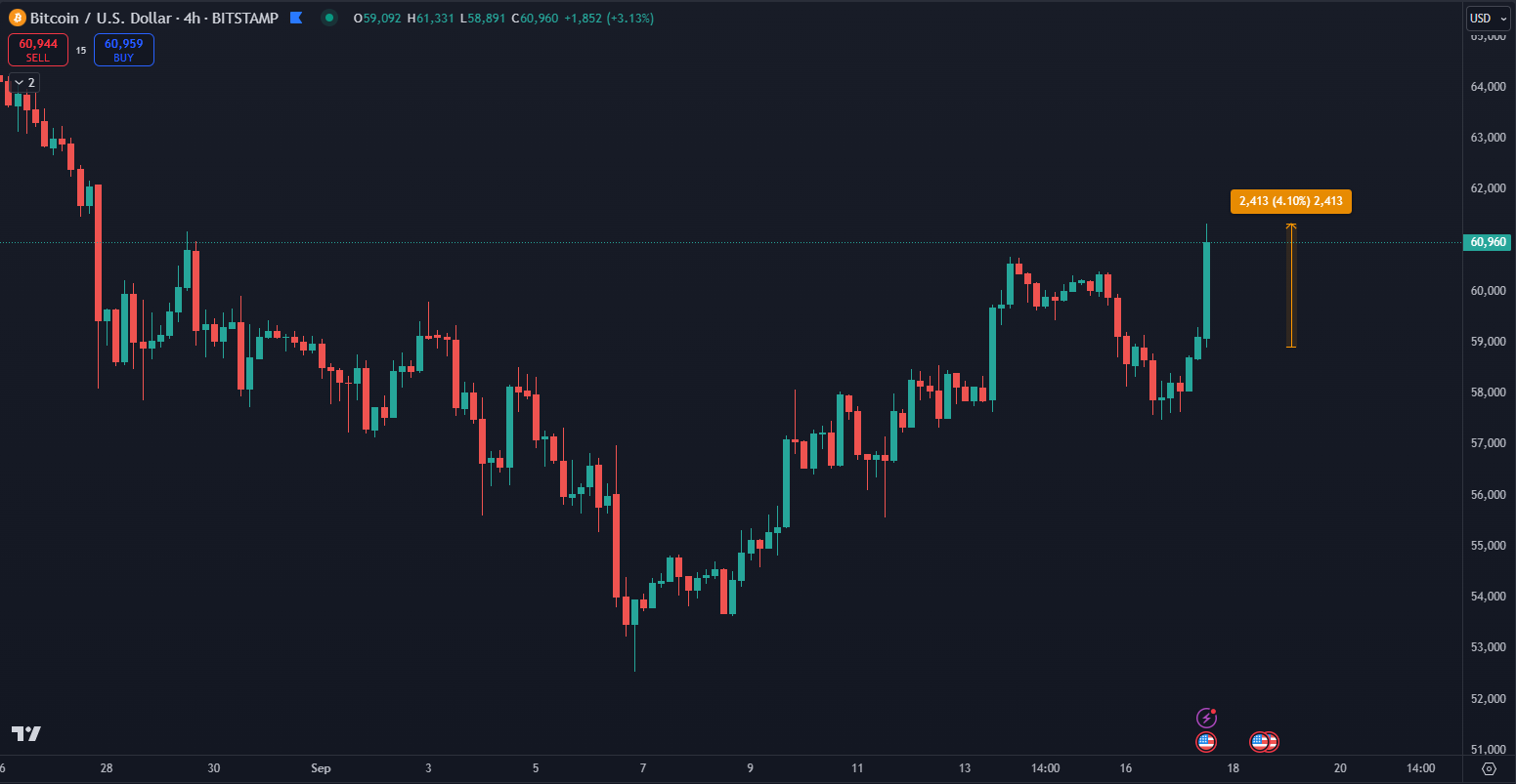 Ako môžete vidieť na krátkodobom cenovom grafe Bitcoinu, po miernom rastúcom trende z ničoho nič došlo k masívnemu vzostupu. Dnešná cena sa pohybovala od úrovne 57 627 do 61 331 dolárov, čo je pomerne široký interval.