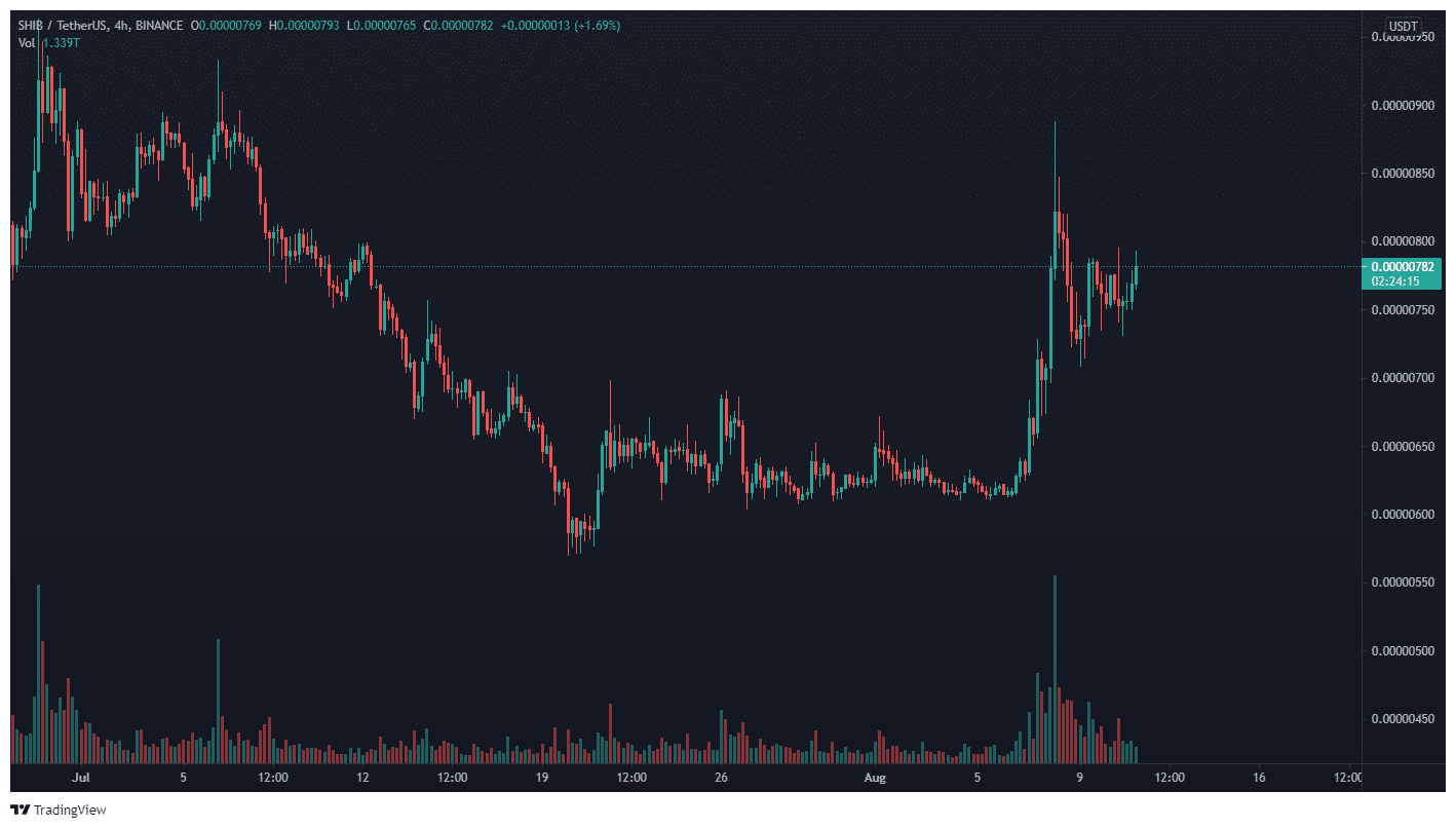 Opäť môžeme potvrdiť, že kvalitný fundament takmer vždy vystrelí cenu projektu vyššie. Inak to nie je ani v tomto prípade. Token SHIB zaznamenal až 3-násobný nárast objemu obchodov. Následne sa cena vyšplhala nahor o 56 % na svoje týždenné maximum.