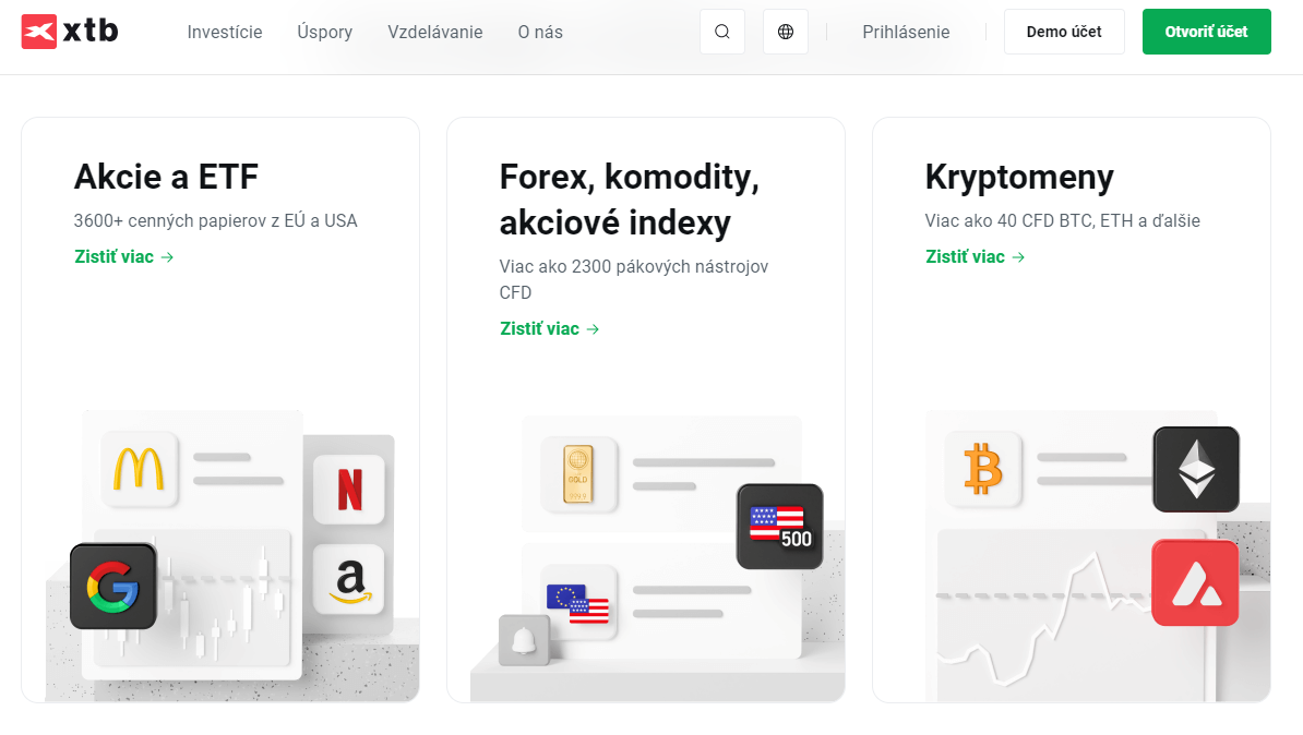 XTB je renomovaný broker pôsobiaci celosvetovo, a teda aj v rámci Slovenska. Ponúka rozsiahle portfólio investičných možností. Disponuje licenciami od renomovaných regulačných autorít. XTB môže byť vašou vstupnou bránou k lepšej finančnej stabilite. Kompletnú recenziu XTB nájdete tu.