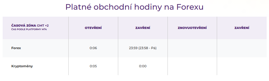 Obchodovanie na burze neprebieha nonstop a je potrebné vedieť dopredu, aké sú dostupné obchodné hodiny. Tie sa môžu líšiť podľa toho, či obchodujete Forex, indexy, komodity, akcie alebo futures kontrakty. Obrázok nižšie zobrazuje obchodné hodiny pre Forex. Kompletný prehľad obchodných hodín nájdete tu.
