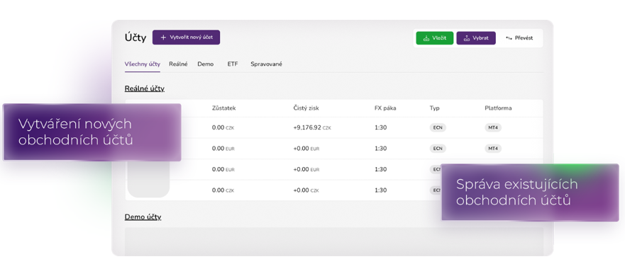 Purple Zone je klientska sekcia určená na vkladanie a vyberanie peňazí. Zároveň tu máte prehľad o vlastných obchodných aktivitách. Spravujete si tu obchodné účty, monitorujete otvorené a uzatvorené obchody a máte tu k dispozícii všetky analytické údaje.