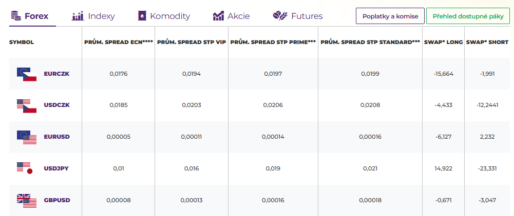 Na Purple Trading si môžete sami určiť, v akej forme chcete prijímať obchodné poplatky. Viete si zvoliť buď účet s nízkymi spreadmi a komisiami za zobchodovaný objem, či účet s vyššími spreadmi, avšak bez komisie za objem. Záleží od typu účtu – viď kapitolu s poplatkami. Kompletný prehľad swapov, spreadov a dividend nájdete tu.
