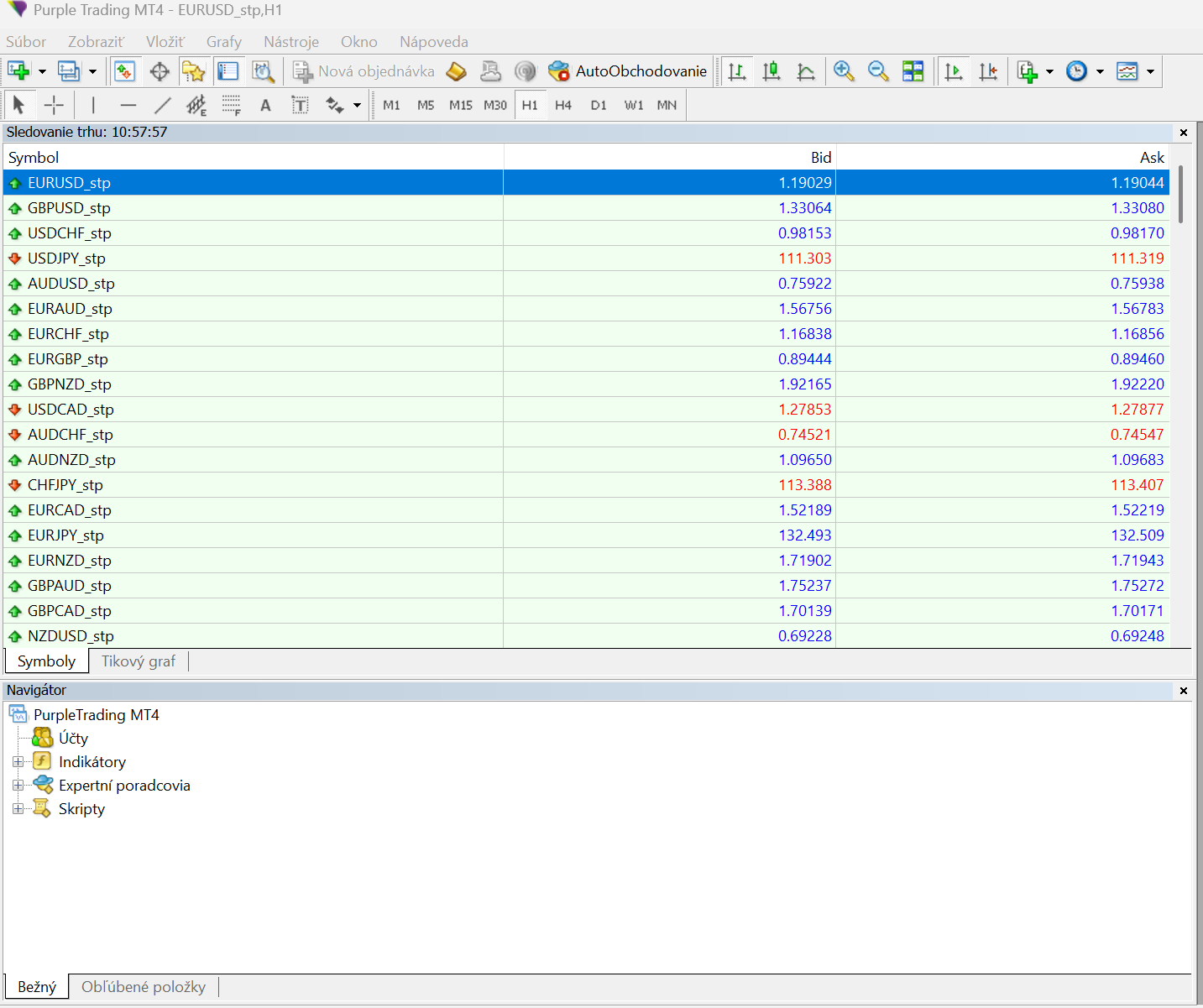 Na obrázku nižšie môžete vidieť rozhranie platformy MT4, konkrétne zoznam menových párov na obchodovanie. V porovnaní s cTrader je táto platforma skôr určená pre pokročilých obchodníkov a aj dizajnom skôr pripomína Microsoft Office aplikácie.