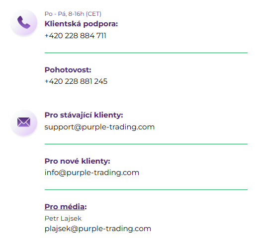 Ako Slovák môžete kontaktovať Purple Trading, pretože poskytujú podporu v slovenčine. Výhodou je jasná komunikácia, prístup k lokálnym informáciám, edukatívnym materiálom a seminárom v rodnom jazyku. Okrem toho máte možnosť spolupracovať so slovenskými obchodnými manažérmi a využiť stratégiu prispôsobenú vášmu trhu. Na obrázku nižšie vidíte všetky možné spôsoby, ako kontaktovať platformu.