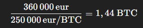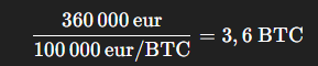 Ďalej si stanovte očakávanú cenu Bitcoinu v čase, keď budete peniaze potrebovať. Ak by cena Bitcoinu bola 100 000 eur za jeden Bitcoin, výpočet je nasledovný: