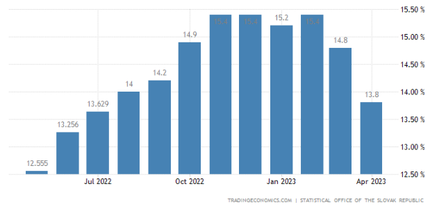 Inflácia na Slovensku opäť klesla a tentokrát bol zaznamenaný najväčší medzimesačný zostup od februára, kedy tempo rastu cien bolo na maxime 15,4 %. Aj keď môžeme tento trend považovať za pozitívny, súčasná úroveň inflácie je podľa údajov Tradingeconomics stále vysoká a zaostáva za priemerom eurozóny.