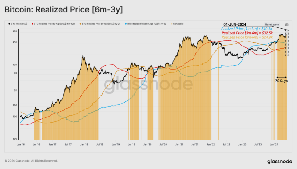 Ak začneme analyzovať priemerné nákupné ceny v rôznych vekových skupinách, prídeme k zaujímavým záverom. Všimli sme si, že skupina držiteľov do 3 mesiacov drží značný objem nerealizovaného zisku, pretože ceny prekročili hladinu 40 000 dolárov. Trh absorboval veľké množstvo distribúcie z tejto skupiny, keď cena Bitcoinu stúpla na 73 000 dolárov.