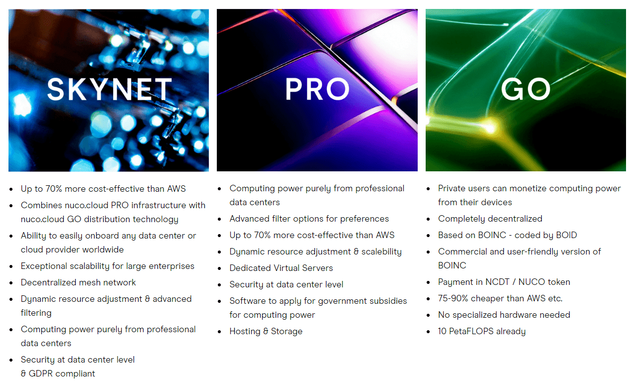 Cloudová platforma Nuco používa decentralizovanú sieť s cieľom poskytnúť čo najviac nákladovo efektívne výpočtové riešenia GPU (procesor na výpočet grafických informácií). Nuco je je menej nákladný ako ktorýkoľvek iný konkurent a umožňuje firmám všetkých veľkostí riešiť zložité výpočtové úlohy bez potreby drahých investícií do hardvéru.