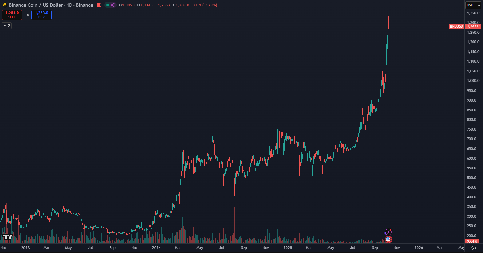 BNB nedávno dosiahol novú rekordnú hodnotu 1 355 dolárov, ukazujú údaje TradingView. Za posledné dva týždne zaznamenal ohromujúci rast približne o 40 % a len za posledných 100 dní dokonca o 120 %. Ide o najvýraznejší cenový pohyb v celej histórii tejto kryptomeny.