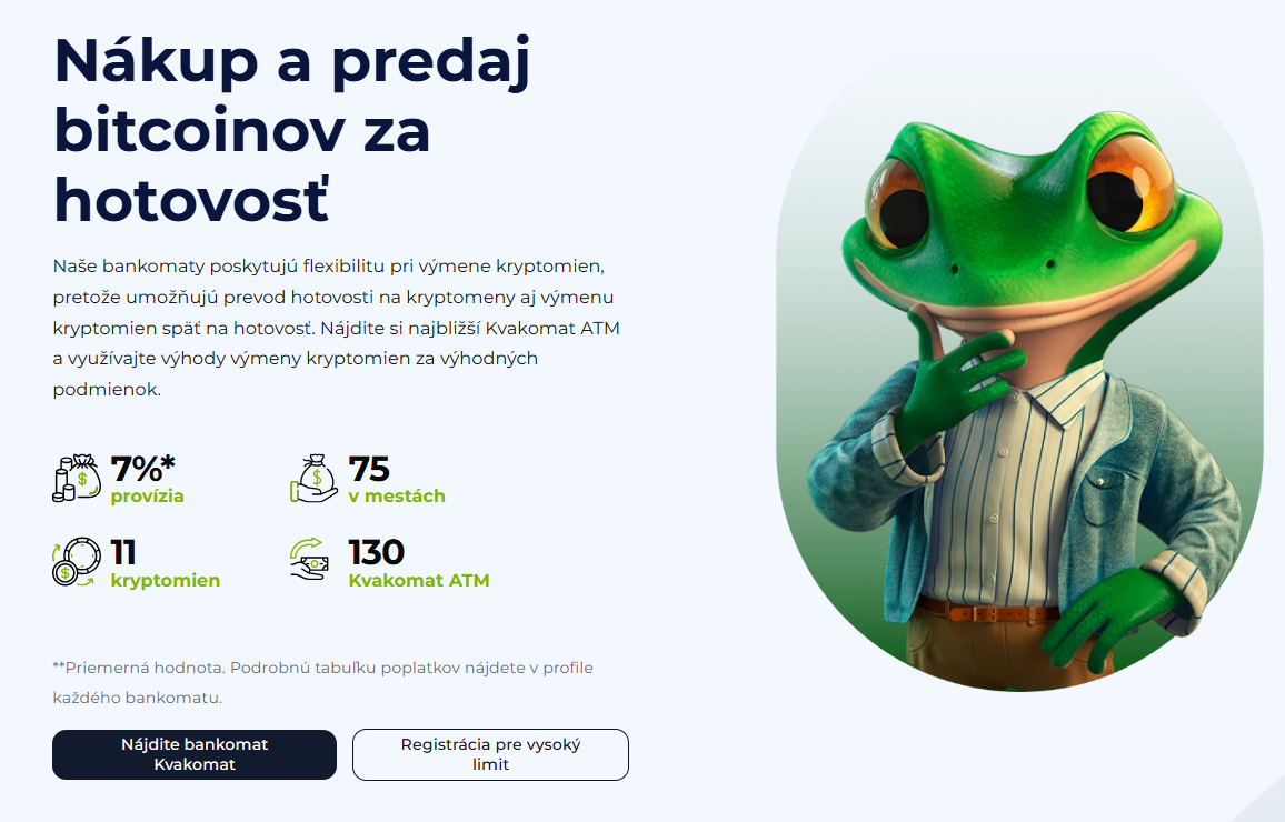 Kvakomat je sieť kryptomenových bankomatov, ktoré poskytujú najjednoduchší spôsob nákupu Bitcoinu a ďalších altcoinov. Vďaka týmto zariadeniam môžete obchodovať s kryptomenami priamo za hotovosť. Nemusíte ani ďaleko chodiť, pretože spoločnosť Kvakomat pokrýva všetky najväčšie mestá na Slovensku, Česku, Maďarsku a Poľsku.