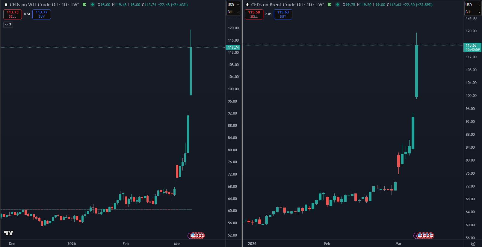 Globálny benchmark Brent posilnil o 23 % na súčasnú cenu 115 dolárov a WTI o 24 % na 113 dolárov. Situáciu vyostruje hrozba Iránu, že zablokuje Hormuzský prieliv. Touto kľúčovou trasou preteká až 20 % svetovej produkcie ropy. Analytici varujú, že ak zostane tento dopravný uzol uzavretý, cena barelu môže do konca marca atakovať hranicu 150 dolárov.