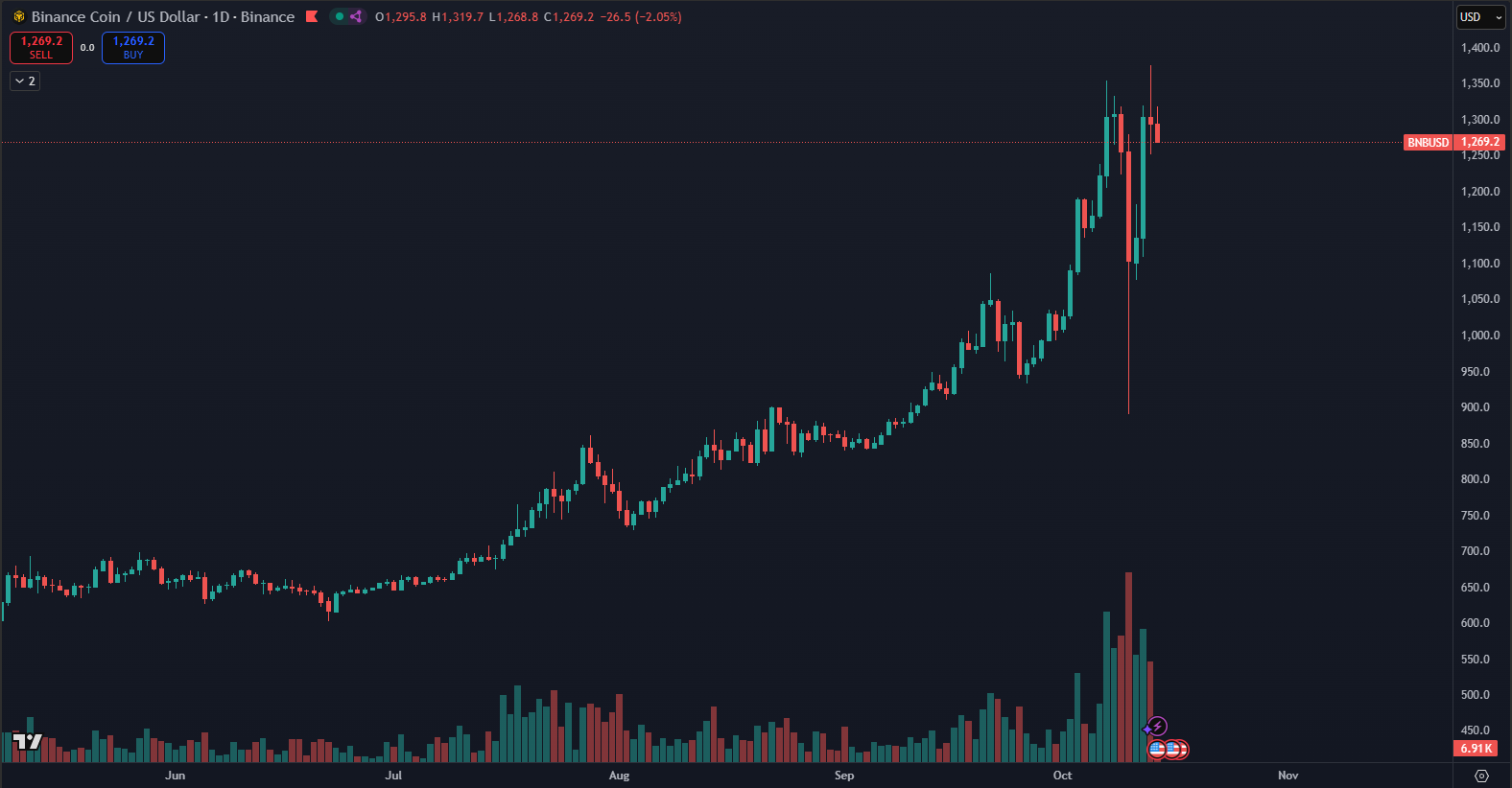Kryptomena BNB počas čierneho piatku 10. októbra zažila prudký pokles, keď na burze Binance klesla o 30 %. Tento prepad však netrval dlho a už v priebehu nasledujúcich dvoch dní dokázala celú korekciu úplne vymazať, ukazujú údaje z TradingView.