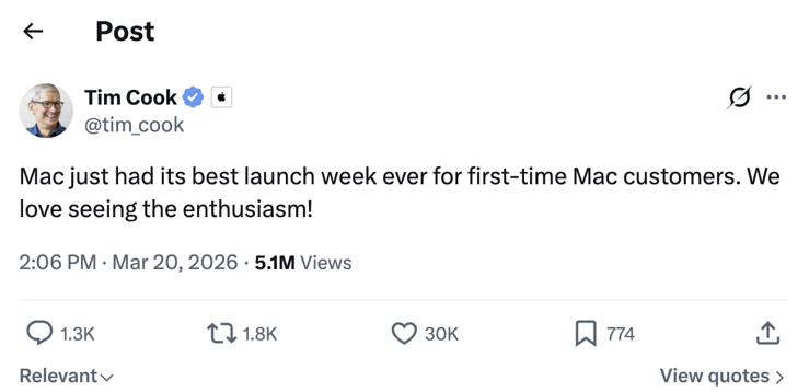 Napriek tomu môže byť jeho význam oveľa väčší, než naznačujú samotné predajné čísla. Podľa Tima Cooka zaznamenal Mac najlepší úvodný týždeň v histórii z hľadiska počtu nových zákazníkov. A práve to je možno najdôležitejší signál. Nejde len o maržu na jednom zariadení, ale hlavne o to, koľko nových ľudí Apple privedie do svojho sveta.