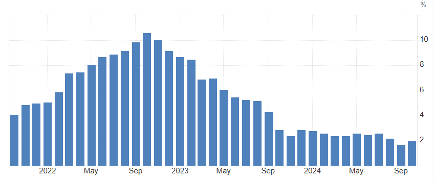 Pokles inflácie v eurozóne na 2 percentá. Zdroj: Tradingeconomics