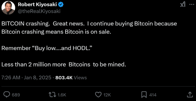 Robert Kiyosaki, svetoznámy podnikateľ a autor knihy Bohatý otec, chudobný otec, považuje pád Bitcoinu za skvelé správy. Aj naďalej tak pokračuje v nakupovaní tejto kryptomeny a teší sa z jej výpredajovej ceny. Investorom radí, aby lacnú cenu využili na nákup a držali.