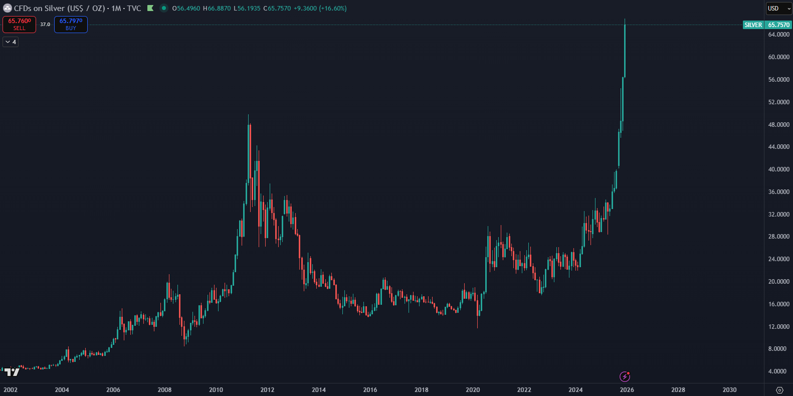 Podľa údajov z analytickej platformy TradingView cena striebra dosiahla nové historické maximum na úrovni 65,75 dolárov. Tento drahý kov zaznamenal najdynamickejší rast vo svojej histórii. Za posledných viac než 2 000 dní vzrástla jeho hodnota o neuveriteľných 460 %, čo potvrdzuje silný dlhodobý trend a rastúci záujem investorov o reálne aktíva v období menovej neistoty.