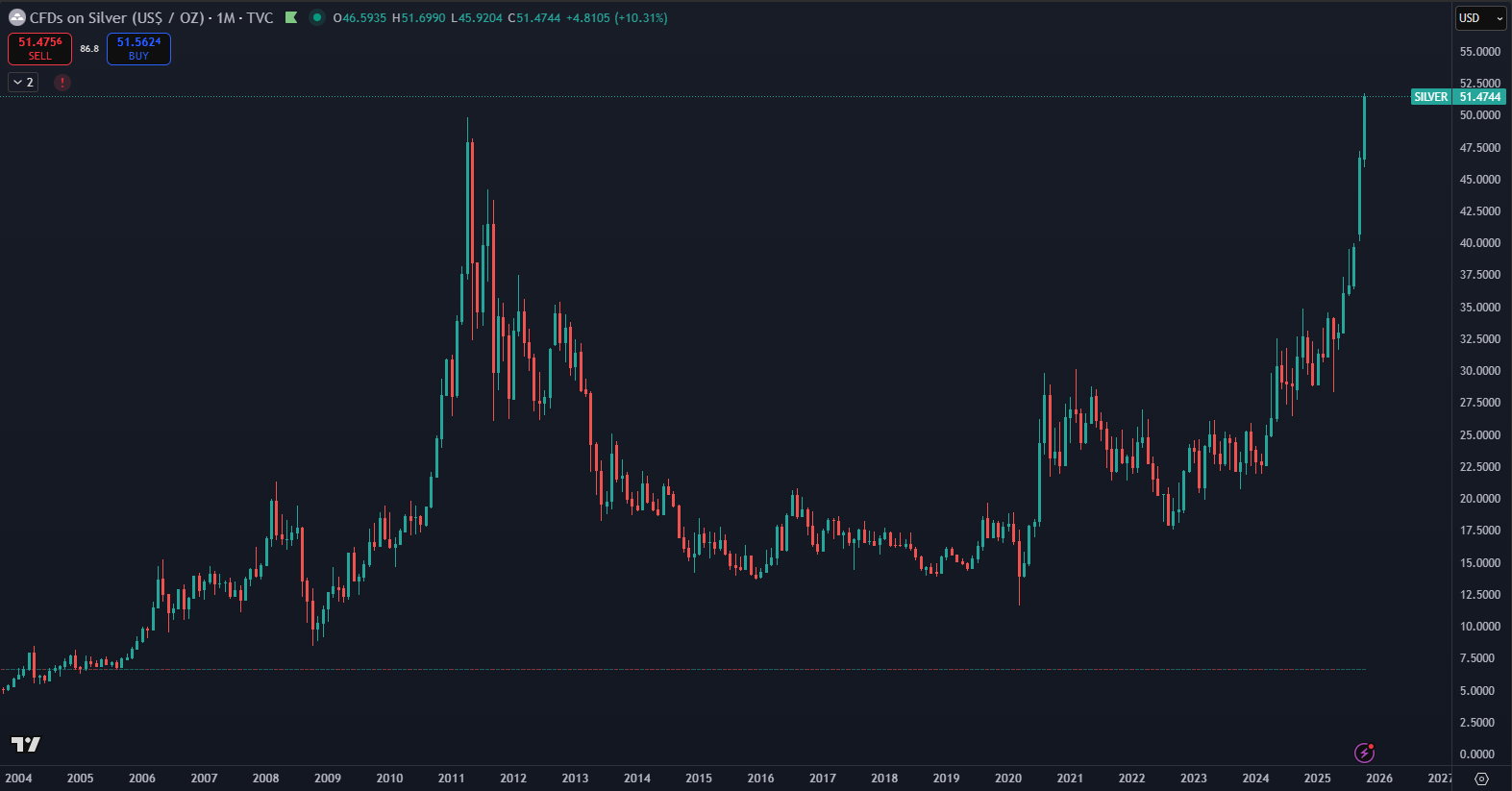 Striebro sa v roku 2025 stalo jedným z najvýkonnejších kovov na svetových trhoch. Podľa údajov TradingView v tomto roku posilnilo až o 78 %, keď sa jeho cena zvýšila z 29 dolárov na aktuálnych 51 dolárov.