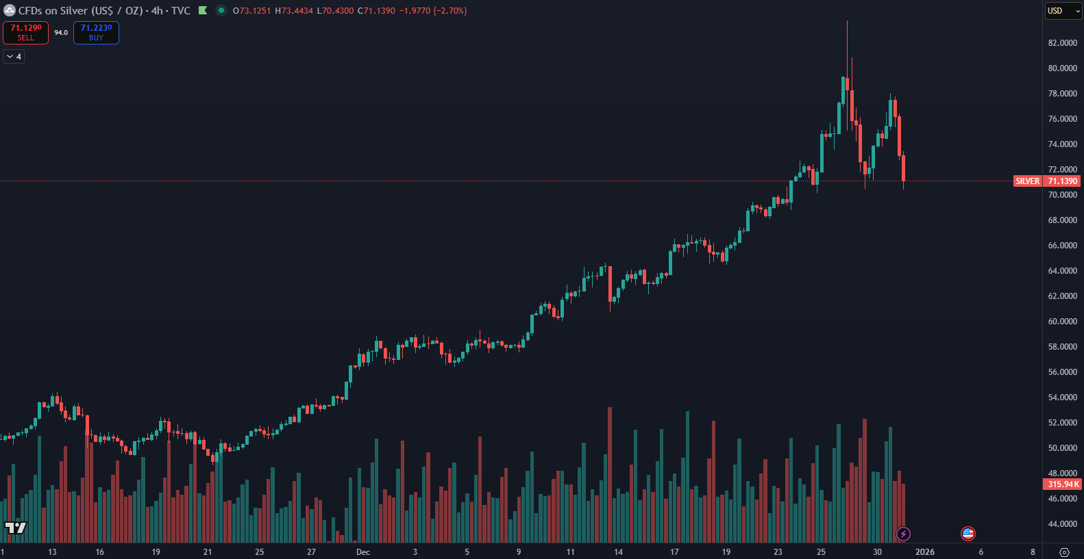 Striebro dosiahlo v tomto roku výnos 142 %, čo predstavuje rast bez historickej obdobnosti. Dňa 29. decembra, podľa údajov TradingView, dosiahla cena historický vrchol 83,75 dolárov. Následne však prišla prudká korekcia a hodnota klesla o 15 % na úroveň približne 71,10 dolárov, čo vyvolalo zvýšenú volatilitu na trhu.