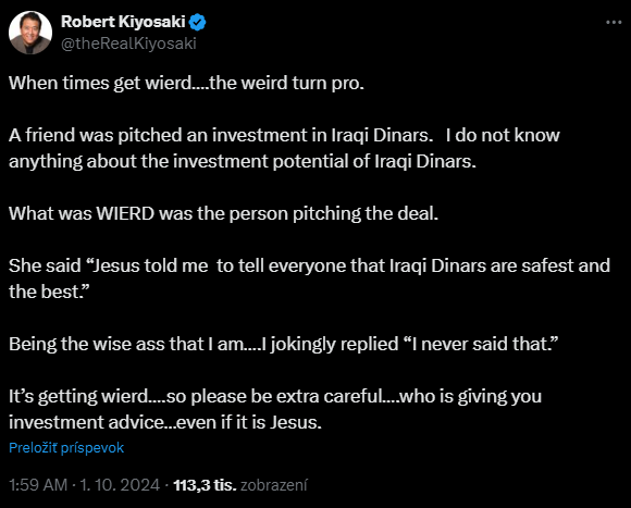 „Keď sa časy stávajú divnými… divní sa stávajú profesionálmi,” opísal slávny autor vo svojom príspevku. Kiyosaki pokračoval: „Priateľovi bol navrhnutý investičný plán do irackých dinárov. Neviem nič o investičnom potenciáli irackých dinárov.”