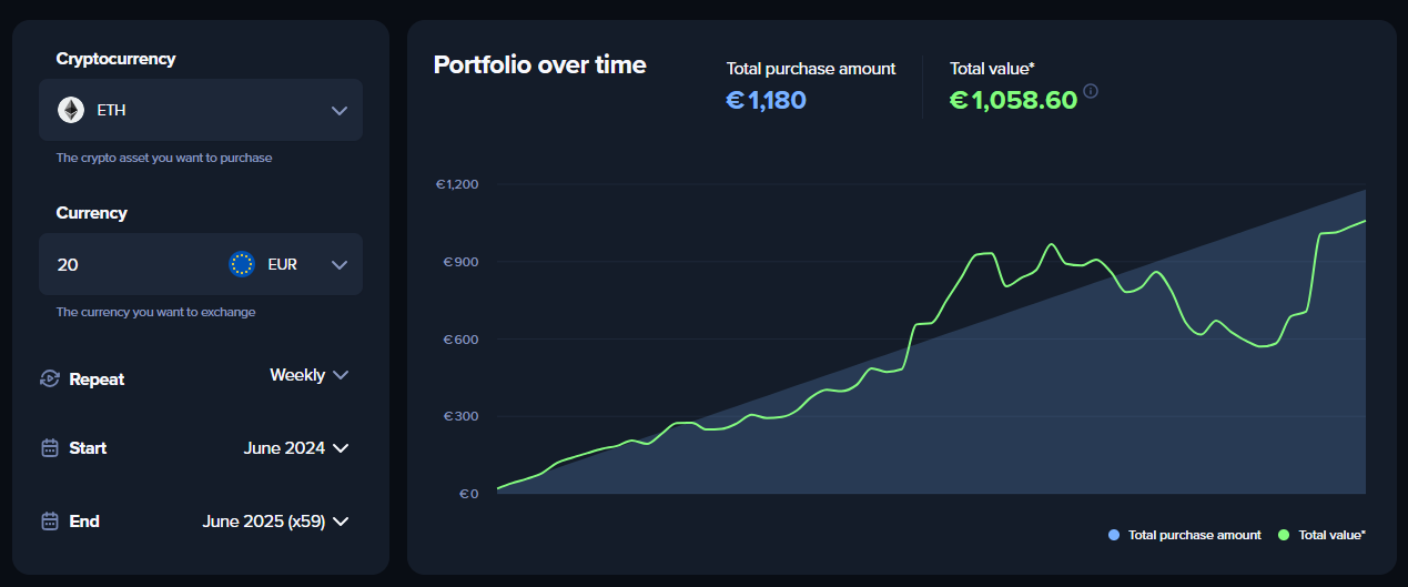 Ethereum zaostalo. Hodnota investície dosiahla približne 1 058 €, čo predstavuje mierny pokles oproti vloženému kapitálu. Graf ukazuje obdobia rastu aj citeľného oslabenia. Napriek tomu pravidelné investovanie zmiernilo dopad výkyvov.