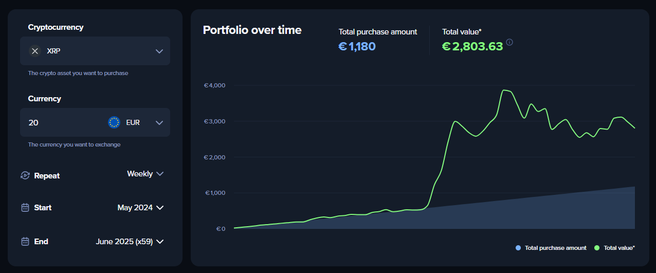 Pri XRP dosiahla celková hodnota portfólia približne 2 803 €. Tento výsledok znamená viac než zdvojnásobenie vloženého kapitálu. Graf ukazuje prudký rast v druhej polovici obdobia, po ktorom nasledovala korekcia. Pravidelné nákupy pred výrazným rastom umožnili zachytiť silný cenový impulz.