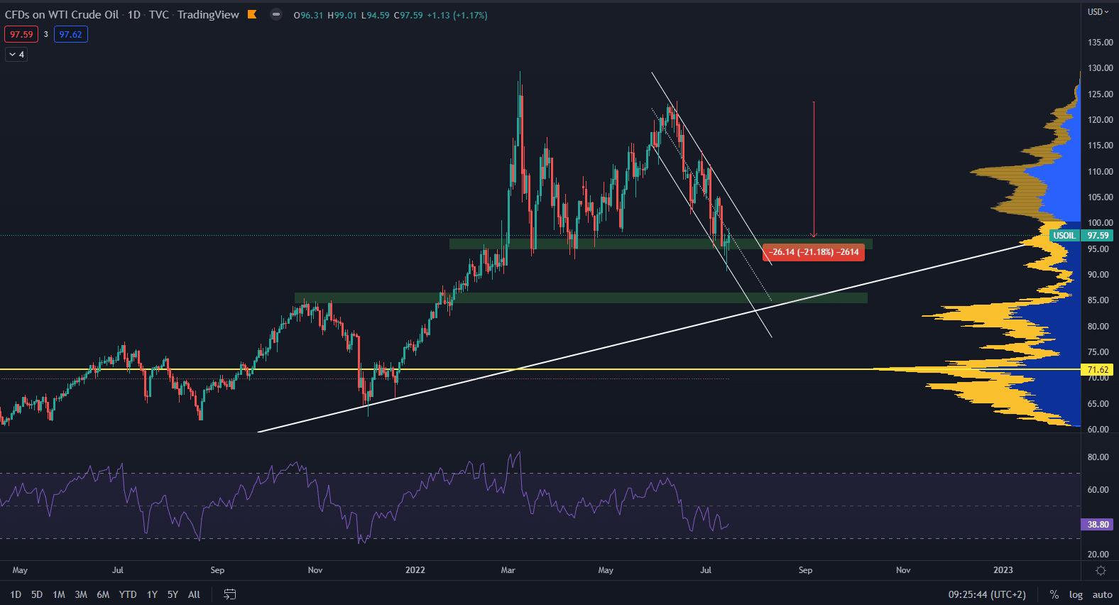 Ropa WTI sa nachádza v klesajúcom trende, konkrétne v patterne vlajky. Aktuálny prepad trvá už jeden mesiac a stále pokračuje. V čase písania článku sa obchoduje na cenovej hladine 97,59 dolárov.