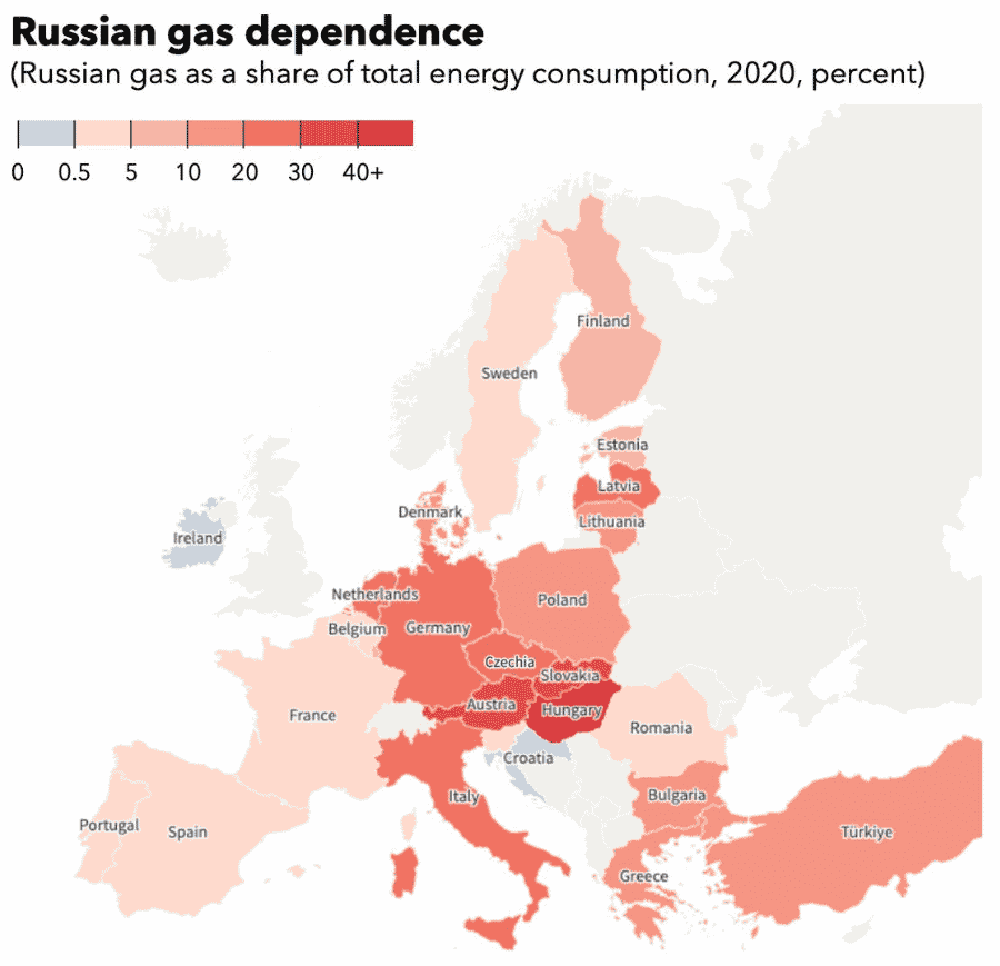 Nasledujúcu mapu zverejnil medzinárodný menový fond, aby ukázal podiel ruského plynu na celkovej spotrebe energie v jednotlivých krajinách.