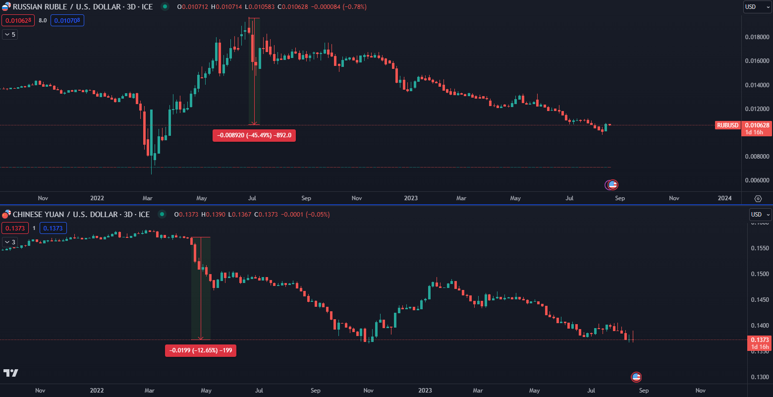 Po tom, čo Spojené štáty uvalili sankcie na Rusko sa začali objavovať mnohé správy o tom, ako sa ázijské krajiny snažia o dedolarizáciu a chcú sa zbaviť dolárovej závislosti. Niektorí investori dokonca predpovedali, že sme na začiatku konca amerického dolára. Podľa správy News Bitcoin sú však práve ruský rubeľ a čínsky juan tie meny, ktoré už dlhšie obdobie strácajú na hodnote.