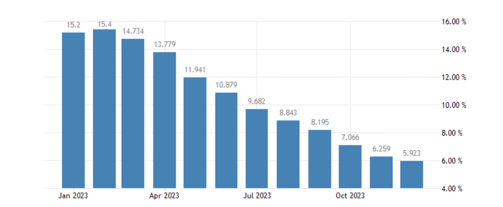 Ročná miera inflácie na Slovensku sa v decembri 2023 znížila na 5,9 %. Ide o najnižšiu hodnotu od decembra 2021, najmä v dôsledku nižšej inflácie v prípade potravín a nealkoholických nápojov (6,5 % oproti 7,8 % v novembri) a bývania a verejných služieb (4,6 % oproti 5,2 %).