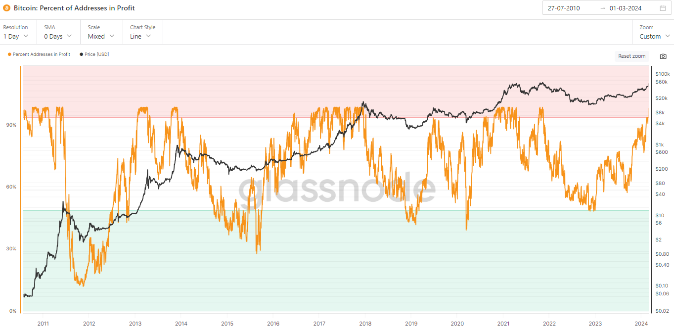 V čase písania je podľa Glassnode v zisku až 99 % bitcoinových adries. Je to logické, keďže trhová cena je blízko historického maxima. Vždy v minulosti, keď bola ziskovosť na úrovni 99 až 100 %, cena vytvorila korekciu. To ale neznamená, že musí nastať okamžite v deň, kedy sieť dosiahla takúto vysokú ziskovosť.