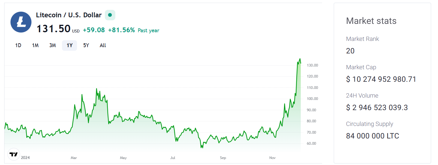Litecoin sa za posledný mesiac viac ako zdvojnásobil, pričom jeho cena sa v súčasnosti pohybuje medzi 97,78 a 131,92 dolármi. Tento významný nárast naznačuje, že býci ovplyvňujú trh. Najbližšia úroveň odporu je na 144 dolároch a prelomenie by mohlo vystreliť cenu smerom k ďalšiemu cieľu 178 dolárov. Takýto pohyb by predstavoval významný percentuálny nárast zo súčasných úrovní. Technické indikátory ukazujú potenciál pre rast, so 100-dňovým jednoduchým kĺzavým priemerom okolo 131 dolárov. Index relatívnej sily sa pohybuje okolo 43, čo naznačuje priestor pre vzostupný pohyb.
