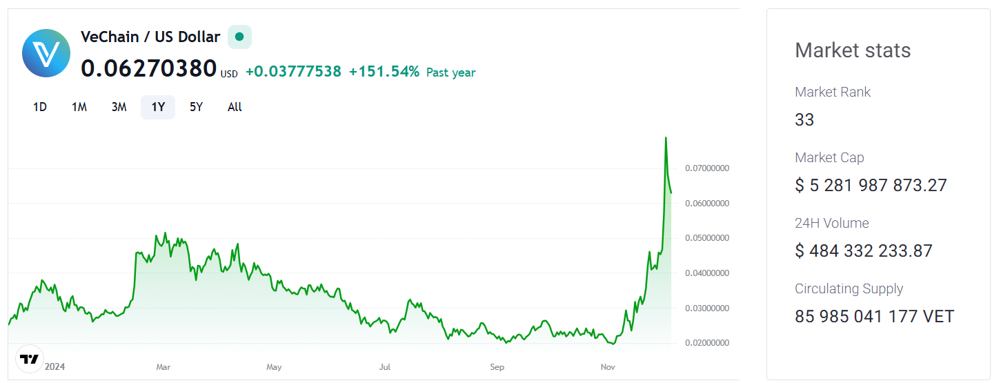 VeChain (VET) zaznamenal výrazný nárast, pričom jeho cena sa za posledný týždeň zvýšila o 57 % a za posledný mesiac o viac ako 220 %. V súčasnosti sa obchoduje medzi 0,04 a 0,05 dolára, kryptomena vykazuje silné rastové momentum. Najbližšia úroveň odporu je na úrovni 0,055 dolára, a ak bude prekonaná, cena by mohla dosiahnuť ďalšiu úroveň 0,066 dolára. Index relatívnej sily (RSI) je na úrovni takmer 40, čo naznačuje priestor pre ďalší rast pred dosiahnutím prekúpených podmienok.