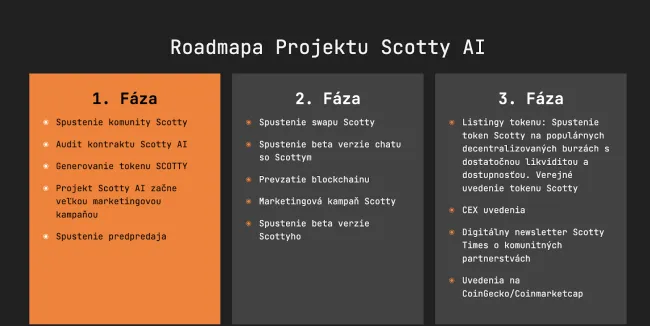 Pohľadom na roadmapu projektu zistíte, že sa aktuálne nachádza v svojej úvodnej fáze. No už v tej ďalšej etape plánuje priniesť ďalšie možnosti využitia. Konkrétne ide o swap platformu pre bezproblémovú zámenu kryptomien, ale aj Scottychat – chatbota s využitím umelej inteligencie.