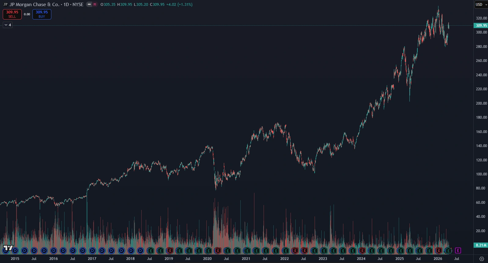 Pohľad na akciový graf vývoja ceny akcií JPMorgan prináša prekvapivé zistenie. Hoci správa o predaji akcií Jamiem Dimonom v hodnote 40 miliónov dolárov vyvolala rozruch, cena akcií na tento krok nereagovala žiadnym dramatickým prepadom. Aktuálne sa akcia obchoduje za 309,95 dolára za kus, čo predstavuje nárast o 1,31 % za posledný obchodný deň.